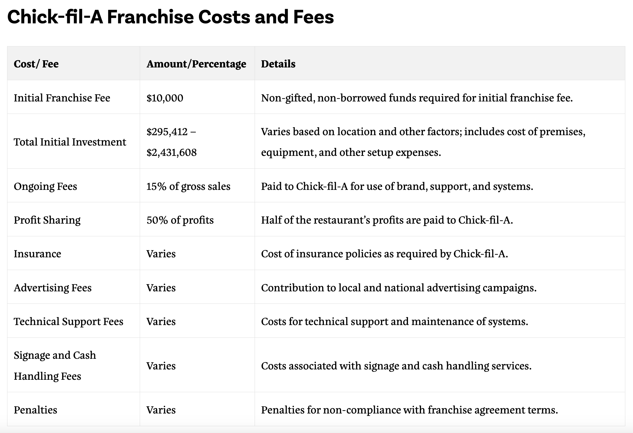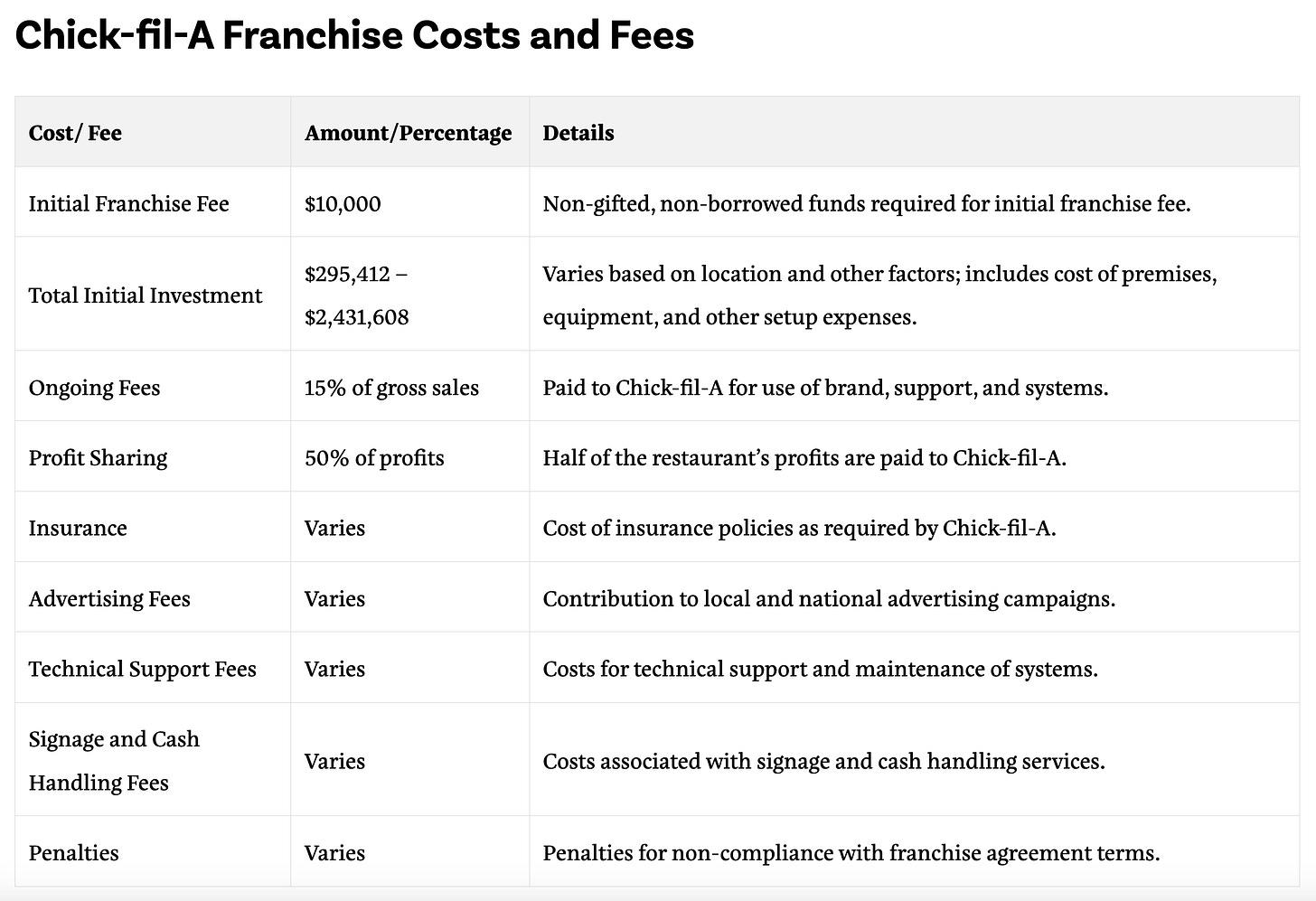 High Ongoing Fees: The significant percentage of gross sales and profits paid to Chick-fil-A reduces net earnings.